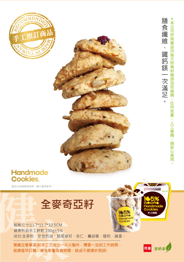 2015年最新商品!! 採用全麥粉烘焙 ~ 內含 葵花籽 蔓越莓 奇亞籽(鼠尾草籽) !! 奇亞籽是近兩年來非常火熱的商品 營養價值非常高 膳食纖維 促進腸胃蠕動 色胺酸 幫助睡眠 每8g奇芽子含有 Omega3/鮭魚的7倍 鐵/波菜的3倍 鈣/牛奶的8倍 鎂/花椰菜的15倍 105%手工餅乾有幸幫台灣最專業代理商 代工奇亞籽餅乾 因此能以合作價拿到此款材料 !! 歷經6個多月研發出此款 全麥奇亞籽餅乾 口感上是走酥脆口感 !!